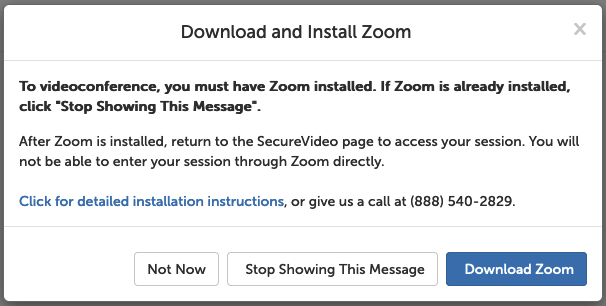 You will be automatically prompted to download and install Zoom when attempting to join a meeting but we recommend going through the process below and testing the connection/audio/video ahead of time to be sure everything is working before an actual session. If you have any questions, or would like to schedule a test session, please don't hesitate to contact the support team at (888) 540-2829, or email us at [email protected] (please include your timezone and that you want to test Zoom).