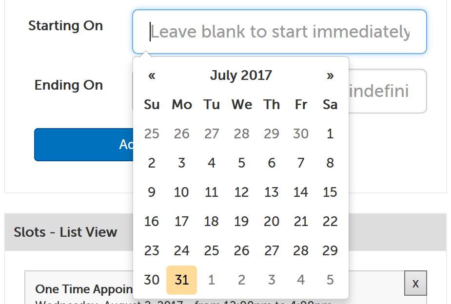 7. Click on the "Starting On" field to make the datepicker appear, and select the date the out of office slot should start on. (Leave blank to start immediately.)